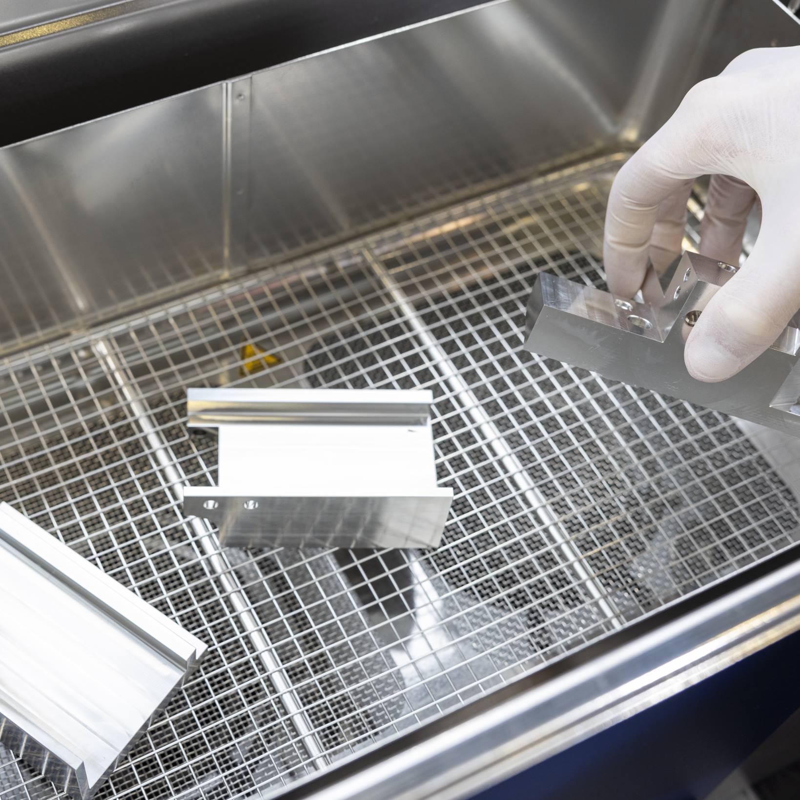 Eine integrierte UV- und Weißlichtkontrolle direkt im Container ermöglicht es unseren geschulten Mitarbeitern, Rückstände sofort zu identifizieren und gezielt nachzuarbeiten. So wird sichergestellt, dass jedes Bauteil die geforderten Reinheitsstandards der Hightech-Industrie erfüllt.